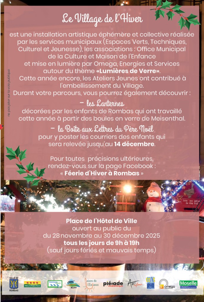 FEERIE D’HIVER La 11ème édition de Féerie d’Hiver à Rombas aura lieu du 25 novembre au 30 décembre 2025 . Télécharger le programme Partager : Cliquer pour partager sur X(ouvre dans une nouvelle fenêtre) X Cliquez pour partager sur Facebook(ouvre dans une nouvelle fenêtre) Facebook J’aime chargement…