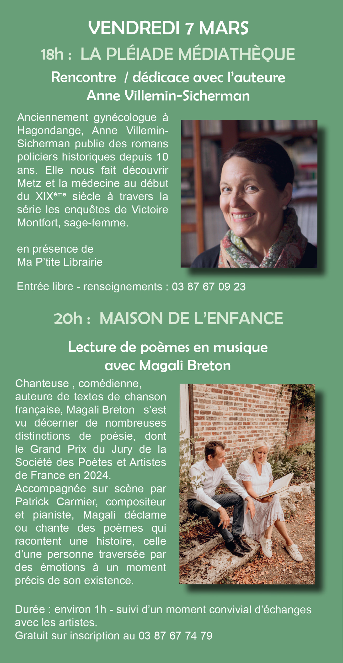 Anciennement gynécologue à Hagondange, Anne Villemin-Sicherman publie des romans policiers historiques depuis 10 ans. Elle nous fait découvrir Metz et la médecine au début du XIXème siècle à travers la série les enquêtes de Victoire Montfort, sage-femme.