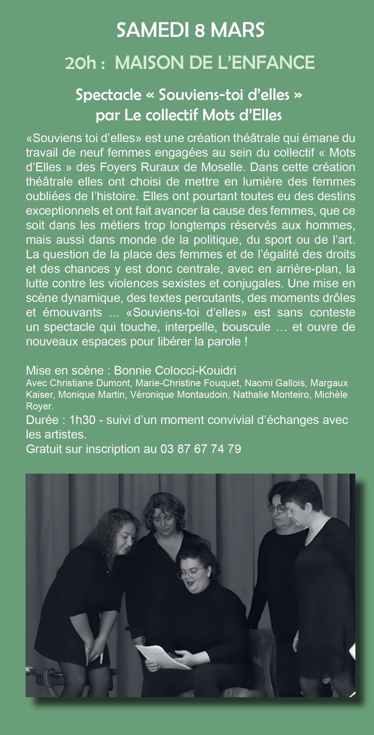 «Souviens toi d’elles» est une création théâtrale qui émane du travail de neuf femmes engagées au sein du collectif « Mots d’Elles » des Foyers Ruraux de Moselle. Dans cette création théâtrale elles ont choisi de mettre en lumière des femmes oubliées de l’histoire qui pourtant ont toutes eu des destins exceptionnels et ont fait avancer la cause des femmes, que ce soit dans les métiers trop longtemps réservés aux hommes, mais aussi dans monde de la politique, du sport ou de l’art. La question de la place des femmes et de l’égalité des droits et des chances y est donc centrale, avec en arrière-plan, la lutte contre les violences sexistes et conjugales. Une mise en scène dynamique, des textes percutants, des moments drôles et émouvants … «Souviens-toi d’elles» est sans conteste un spectacle qui touche, interpelle, bouscule … et ouvre de nouveaux espaces pour libérer la parole !